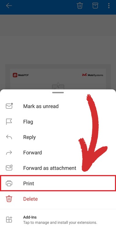 Устройствата с Android използват системната функция за печат, за да експортират имейли като PDF файлове.