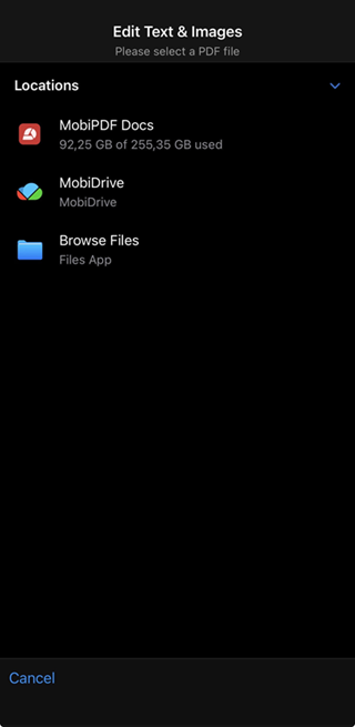 Gehe von Startseite zu Text und Bilder bearbeiten und lade dein PDF-Dokument aus einer Datei auf deinem Telefon oder aus der Cloud.