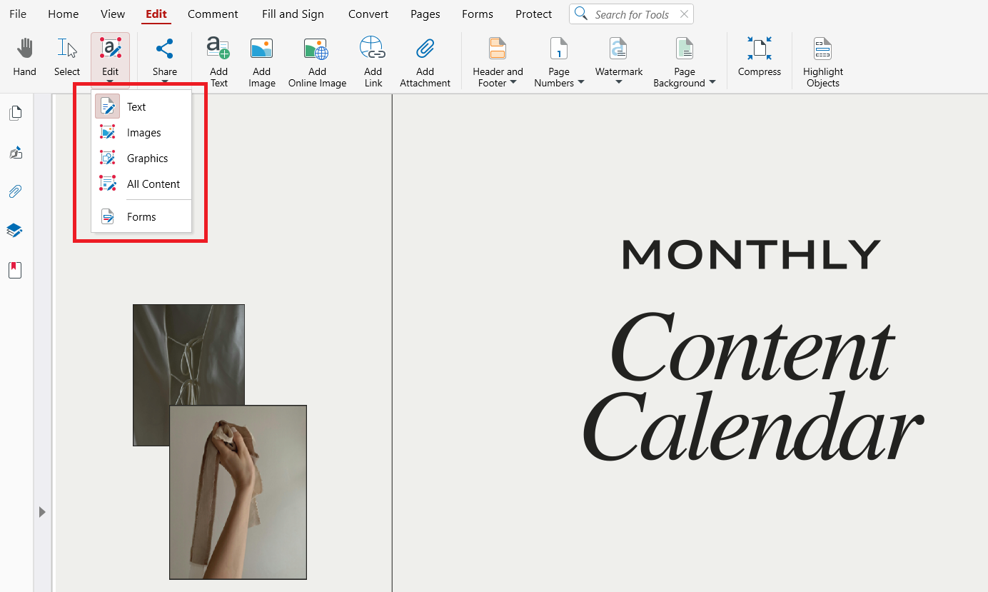 Editable text box with the word ‘July’ selected above the title ‘Content Calendar’ in MobiPDF.
