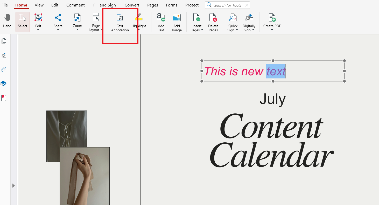 New pink text annotation added to a PDF page in MobiPDF above the ‘July Content Calendar’ heading.Mit der richtigen Formatierung fügen sich deine Ergänzungen natürlich in das Dokument ein. Speichere deine Datei zum Schluss, um die Änderungen zu behalten.
