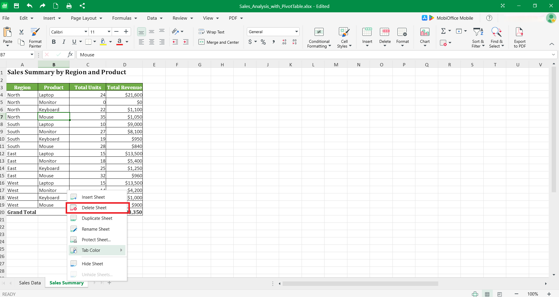 To delete a pivot table in MobiSheets, locate the pivot table first. Once located, right-click on the sheet or highlighted area of a sheet and choose Delete Sheet or Clear PivotTable. This removes the entire pivot table structure while preserving your source data in its original location.