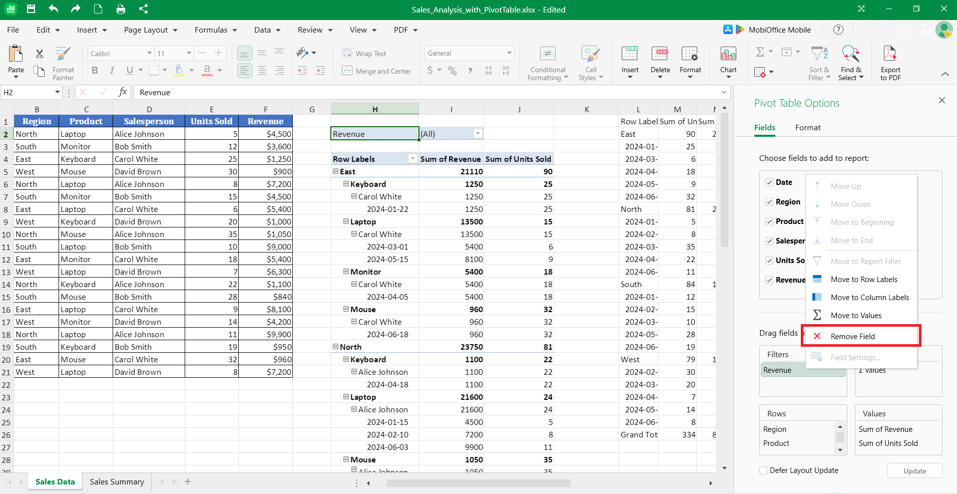 Removing row, column, or value fields reshapes your pivot table to focus on different data dimensions. In MobiSheets, the field list panel shows all active fields in the pivot table structure.