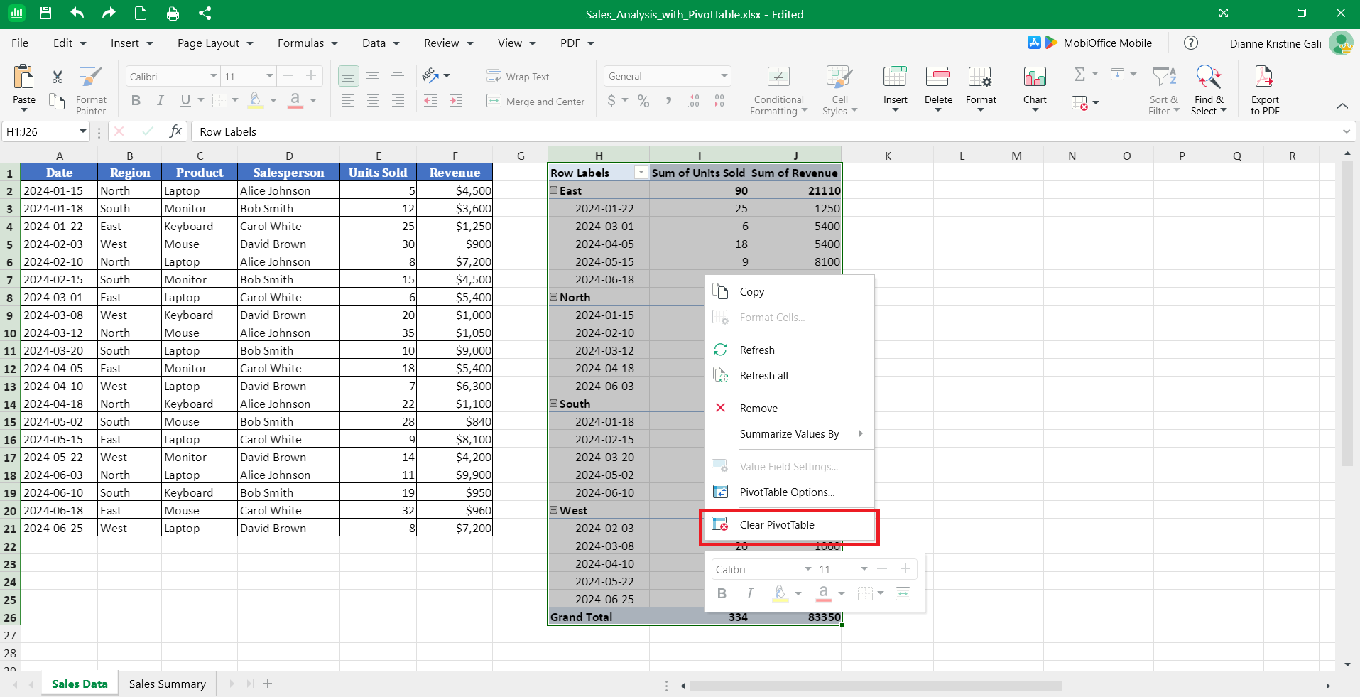 Click the filter dropdown arrow and select Clear Filter to remove filtering from one field, or go to the PivotTable tab and click Clear → Clear Filters to remove all filters at once. Your pivot table refreshes to show unfiltered data.