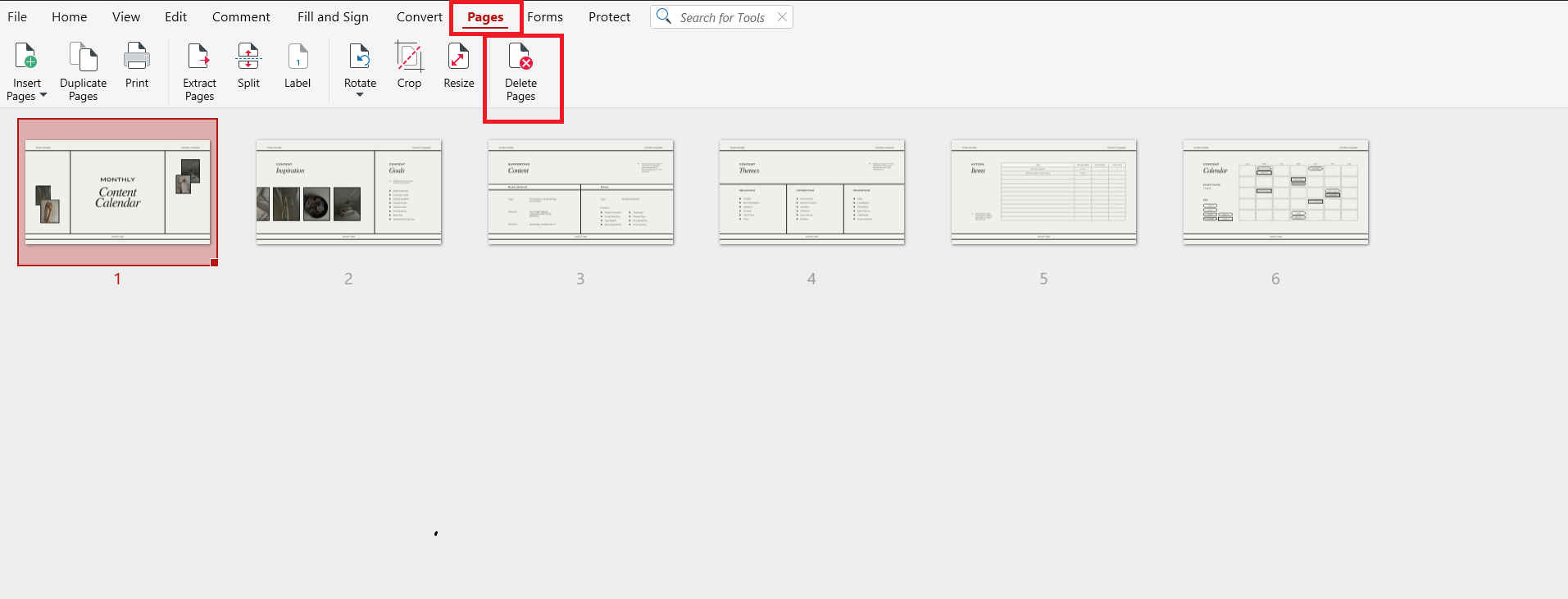2. Haz clic en Páginas en la barra de herramientas y elige Eliminar páginas.