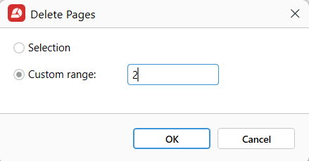 3. En el cuadro de diálogo, elige Rango personalizado para introducir las páginas que quieres eliminar, o selecciona Selección para eliminar la página en la que has hecho clic.