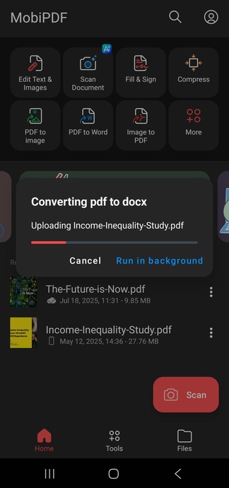Avec MobiPDF, tout est géré pour vous – chargez simplement votre PDF, choisissez PDF en Word dans le menu, et l'application s'occupe du reste.
