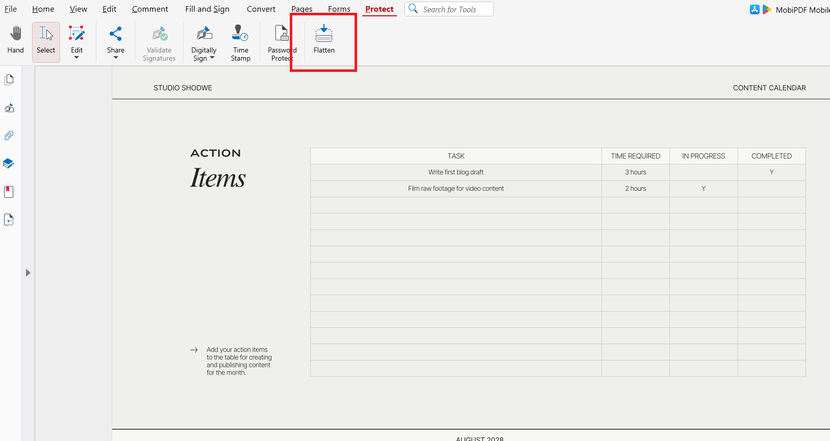 MobiPDF のフラット化ツールは、インタラクティブな要素を文書レイアウトに統合し、編集できないテキストやグラフィックに変換します。