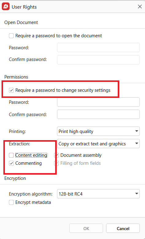 一部の PDF ビューアーは、基本的な権限設定を無視します。また、制限が正しく適用されないまま保存されている可能性もあります。必ず複数のビューアーで保護状態を確認してください。