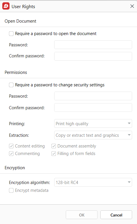 MobiPDFでは、パスワード保護ツールとユーザー権限パネルを使用して設定します。開くためのパスワードを設定せずに編集オプションを無効にできます。