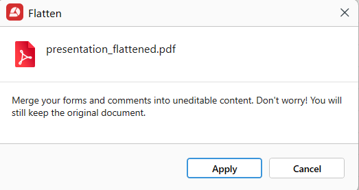 入力が完了したら、 入力可能なPDFをフラット化して閲覧専用にできます。これにより、インタラクティブな要素が編集できない静的なコンテンツに変換されます。
