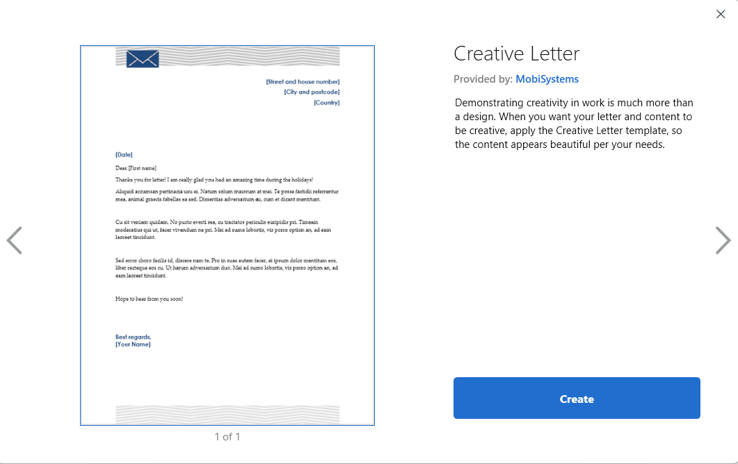 Preview of the Creative Letter template in MobiDocs with a description panel on the right and a Create button to start a new document.