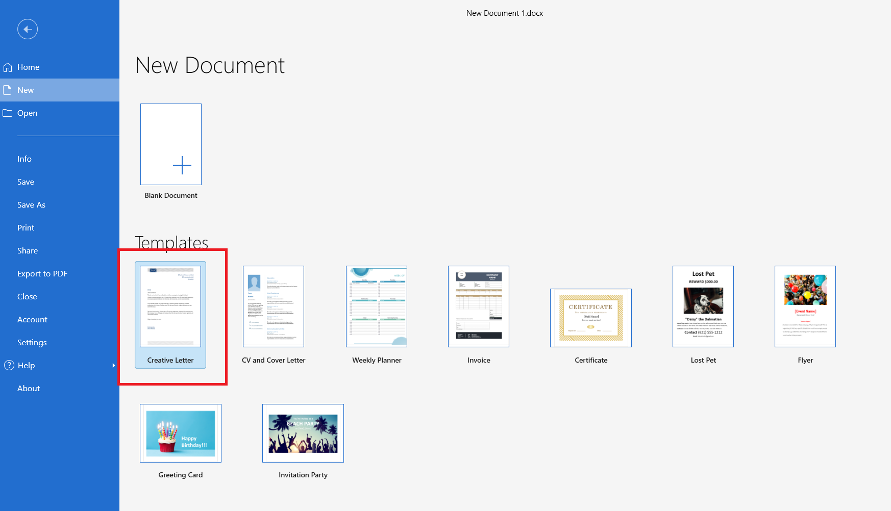 Om een brief te maken vanuit een sjabloon, klik je op het sjabloon Creative Letter in de sjabloonbibliotheek.