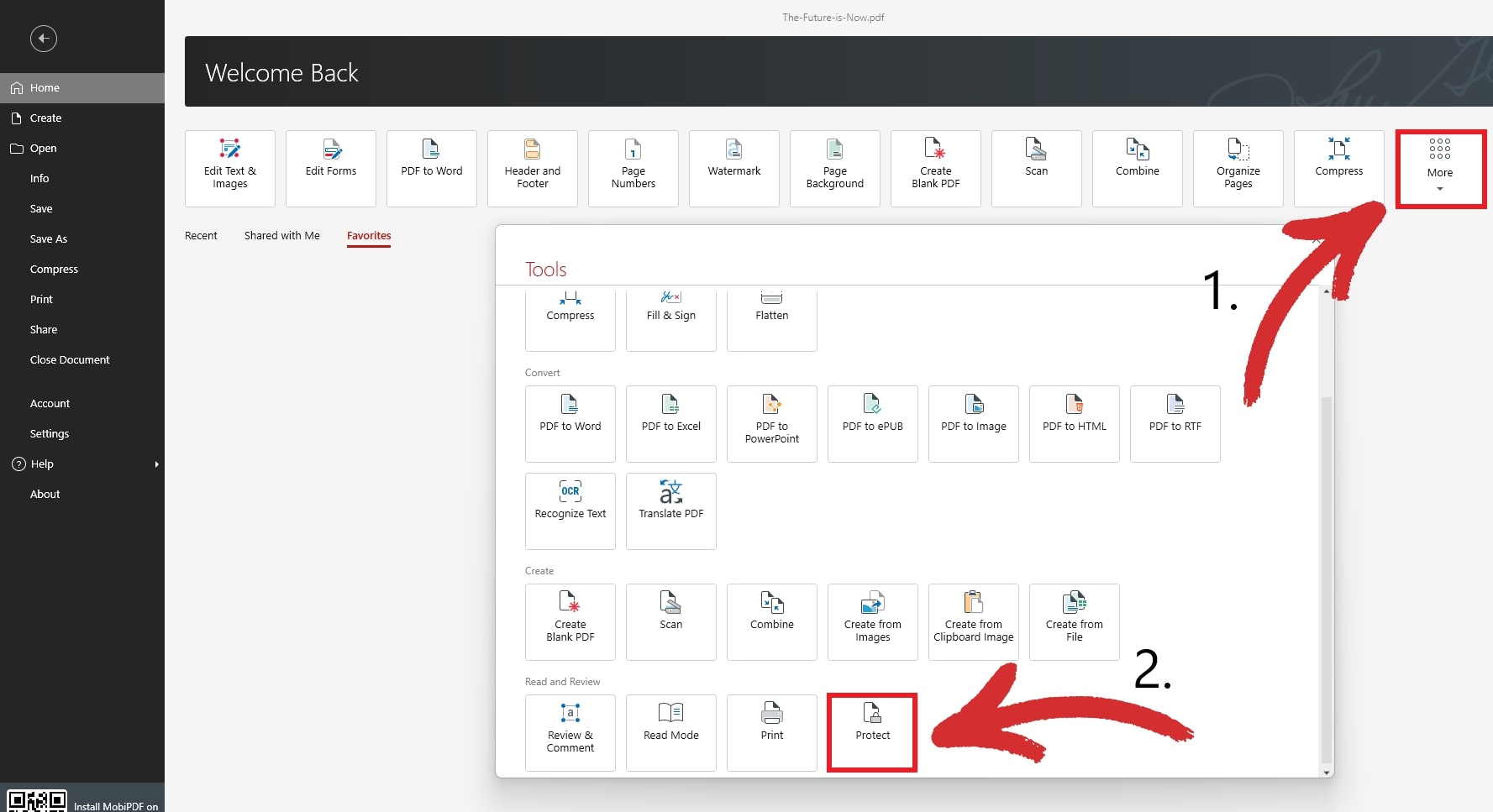 DICA: Você também pode adicionar uma senha ao seu PDF abrindo o documento e clicando em Proteger com senha na guia Proteger.